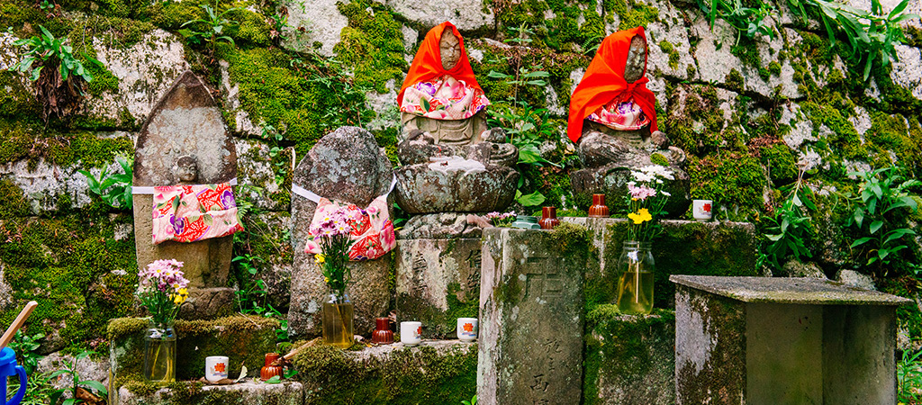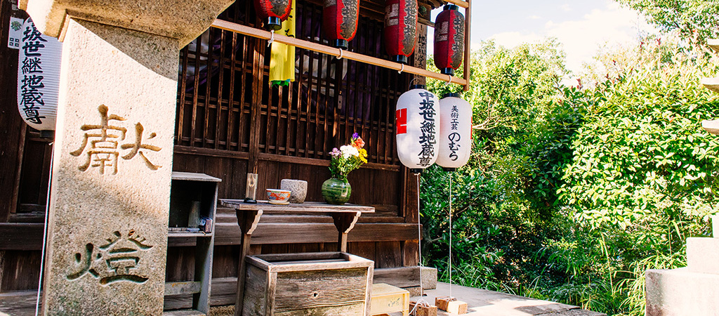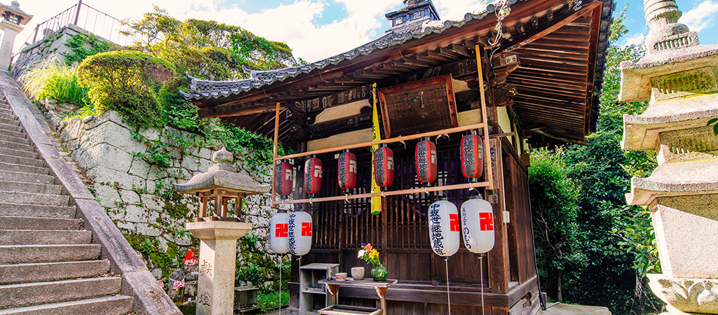 長等神社から観音堂へと登る石段の中程に建つことから「中阪地蔵」と呼ばれている。享保19年(1733)の『近江輿地志略』には「坂の半にあり、地蔵菩薩の像長五尺二寸、定朝作なり」とあり、現在のお堂は、文政2年(1819)の再建で。宝形造、桟瓦葺の簡素な建物ながら正面に虹梁をかけ蟇股をおき、木鼻は獅子の彫刻で飾られている。
