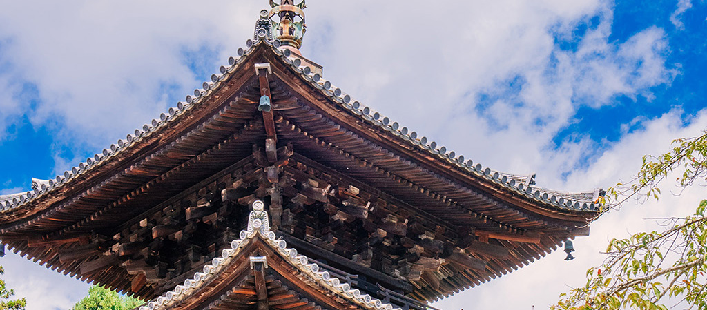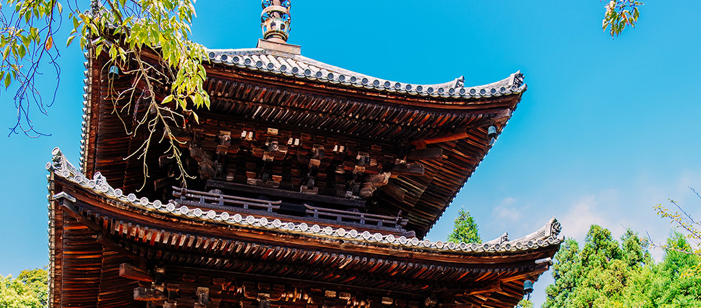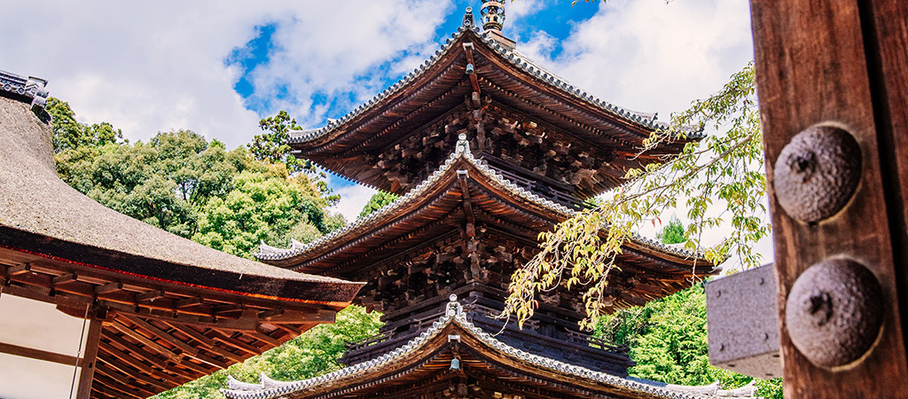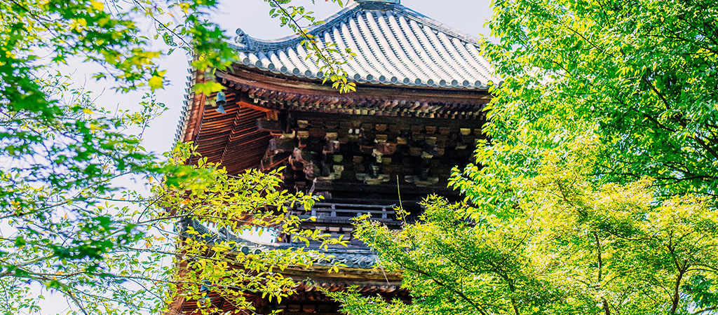 It was donated by Tokugawa Ieyasu to Miidera in 1601 (6th year of Keichō Era). Originally it was the pagoda of Hisodera (now Sesonji) in Nara, then in 1594 (3rd year of Bunroku Era) was brought to Fushimi Castle by Toyotomi Hideyoshi and rebuilt. With its three levels and the metal decorative plates on the sōrin, the top finial, it is a perfect example of Medieval Buddhist pagoda.BACK MAP