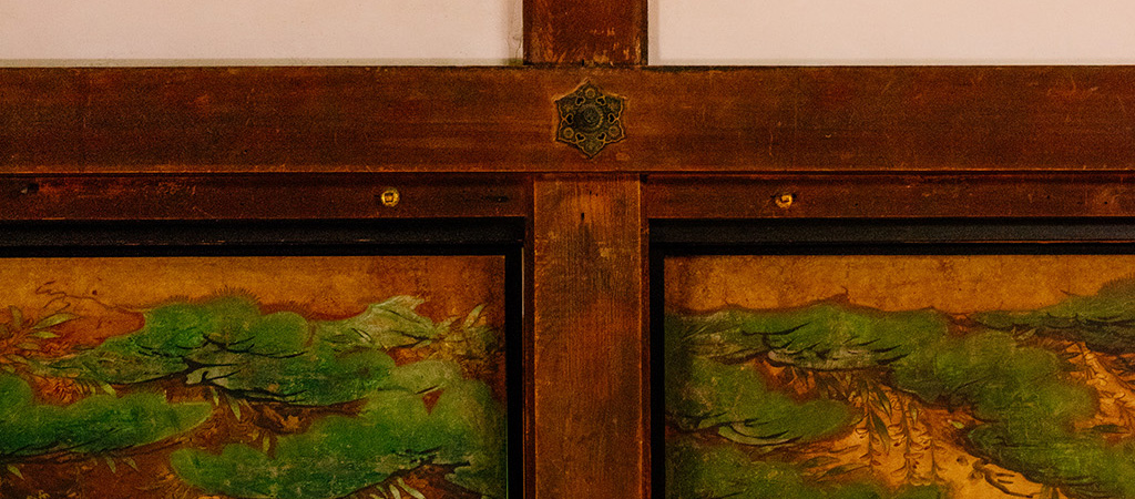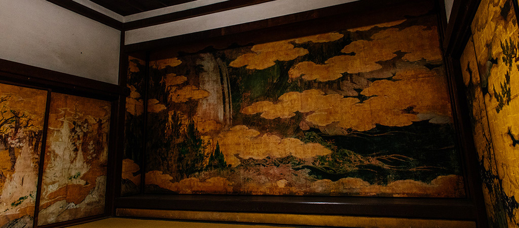 De splendides peintures, chefs d’œuvres de Kanô Mitsunobu, classées bien culturel important, ornent le mur d’alcôve, ainsi que les portes coulissantes de la première et la seconde chambre.
