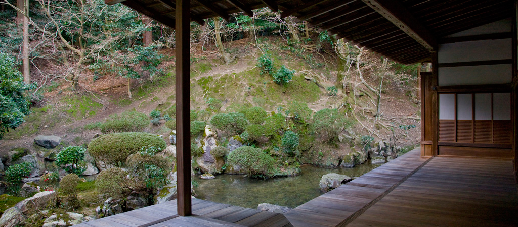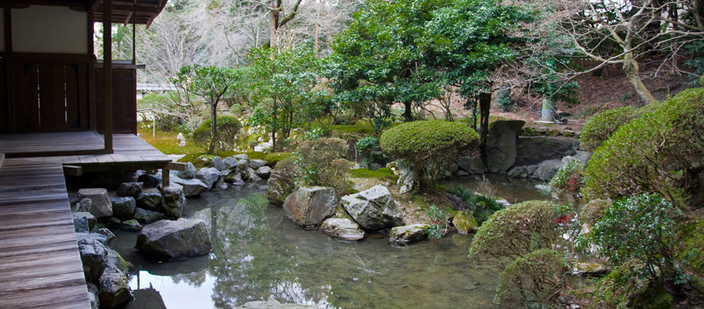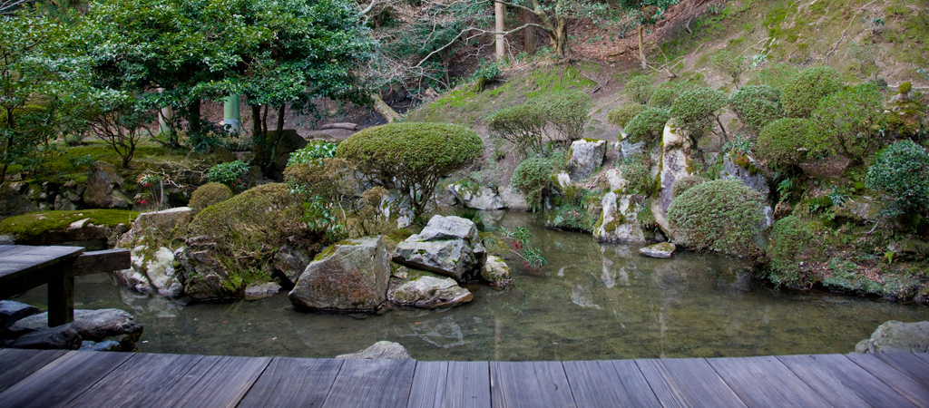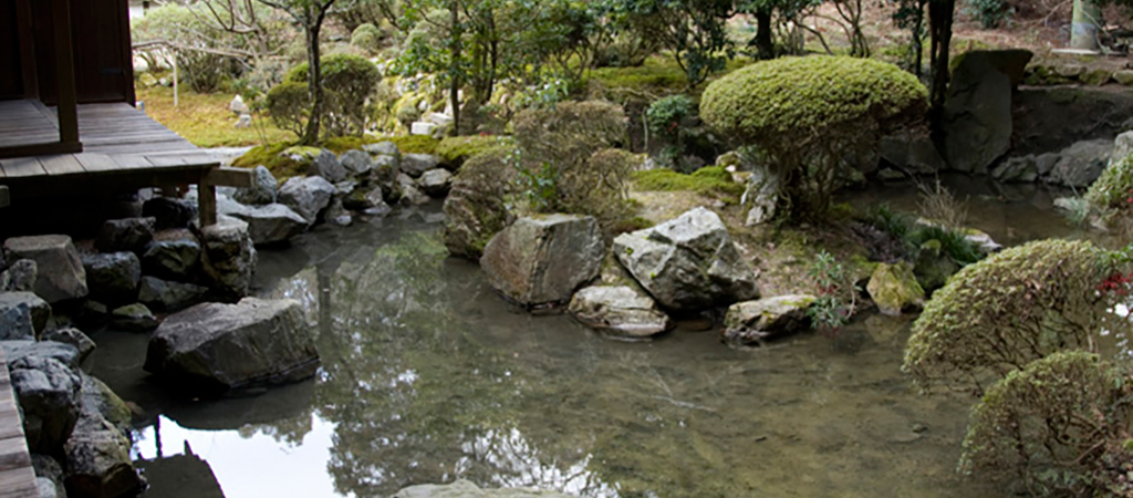 « Voici le jardin du temple Kôjô-in.C’est un jardin de style Chisen Kaiyû qui s’étend au Sud du pavillon des visiteurs du temple Kôjô-in classé trésor national. On présume qu’il a été façonné avant la reconstruction du pavillon en l’an 6 de l’ère Keichô (en 1601).